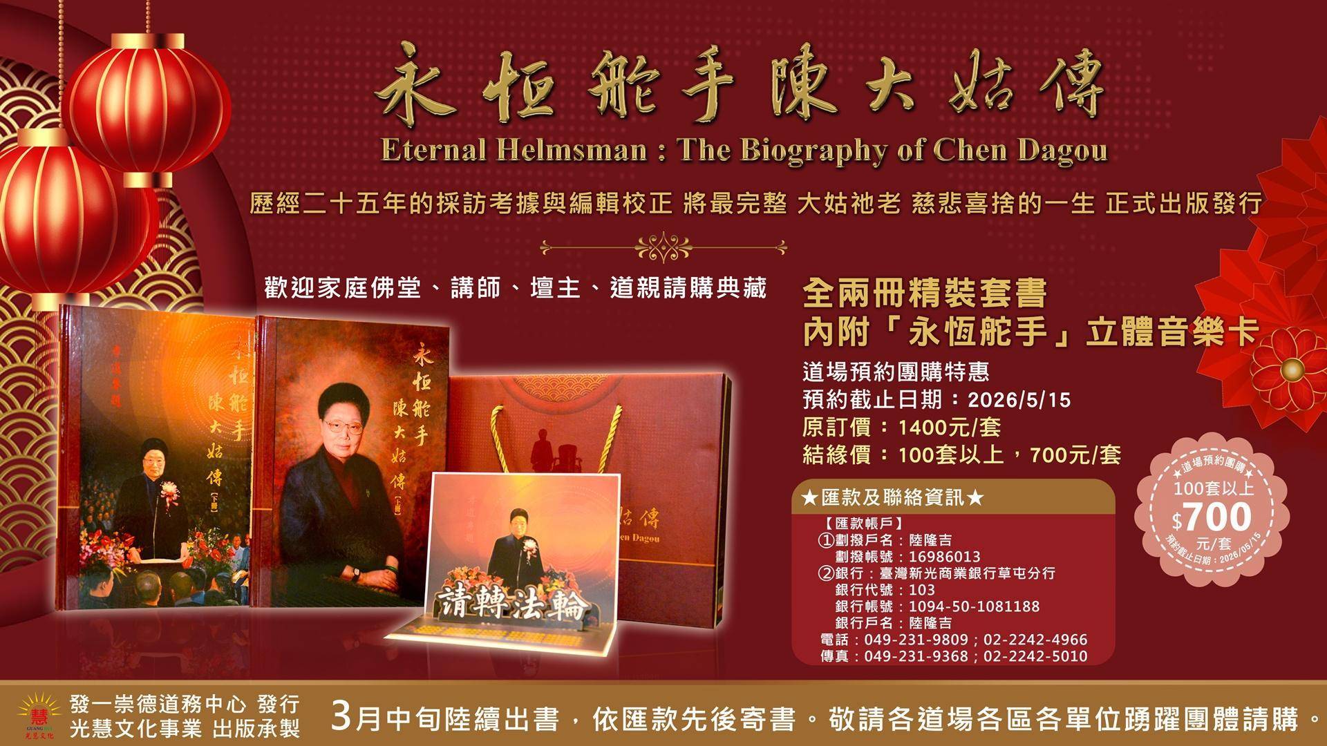 《永恆舵手——陳大姑傳》之內容及字句等,若有誤植、疏漏差錯之處,請您不吝賜教,填寫以下表單 https://forms.gle/zRLG24usFTT7Um1s5,俾使修正勘誤,完善後續之再版。感謝您的填寫,敬祝您:法喜充滿。